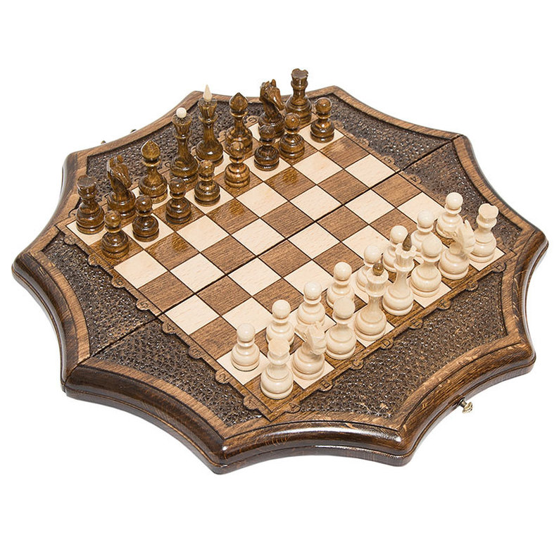 Доска выполнена в форме геометрической фигуры с 10 углами. Грани аккуратно сглажены внутрь, причем сделано это исключительно ручным способом. Лицевая поверхность мелкой резьбой, которая окаймляет поле для шахмат с контрастными клеточками. Даже крючку, который нужен для удерживания створок между собой, было уделено внимание – он сделан из бронзы и вылит в специальной форме с эмблемой производителя. В целом такое изделие как раз показывает, что владелец понимает, что такое стиль.