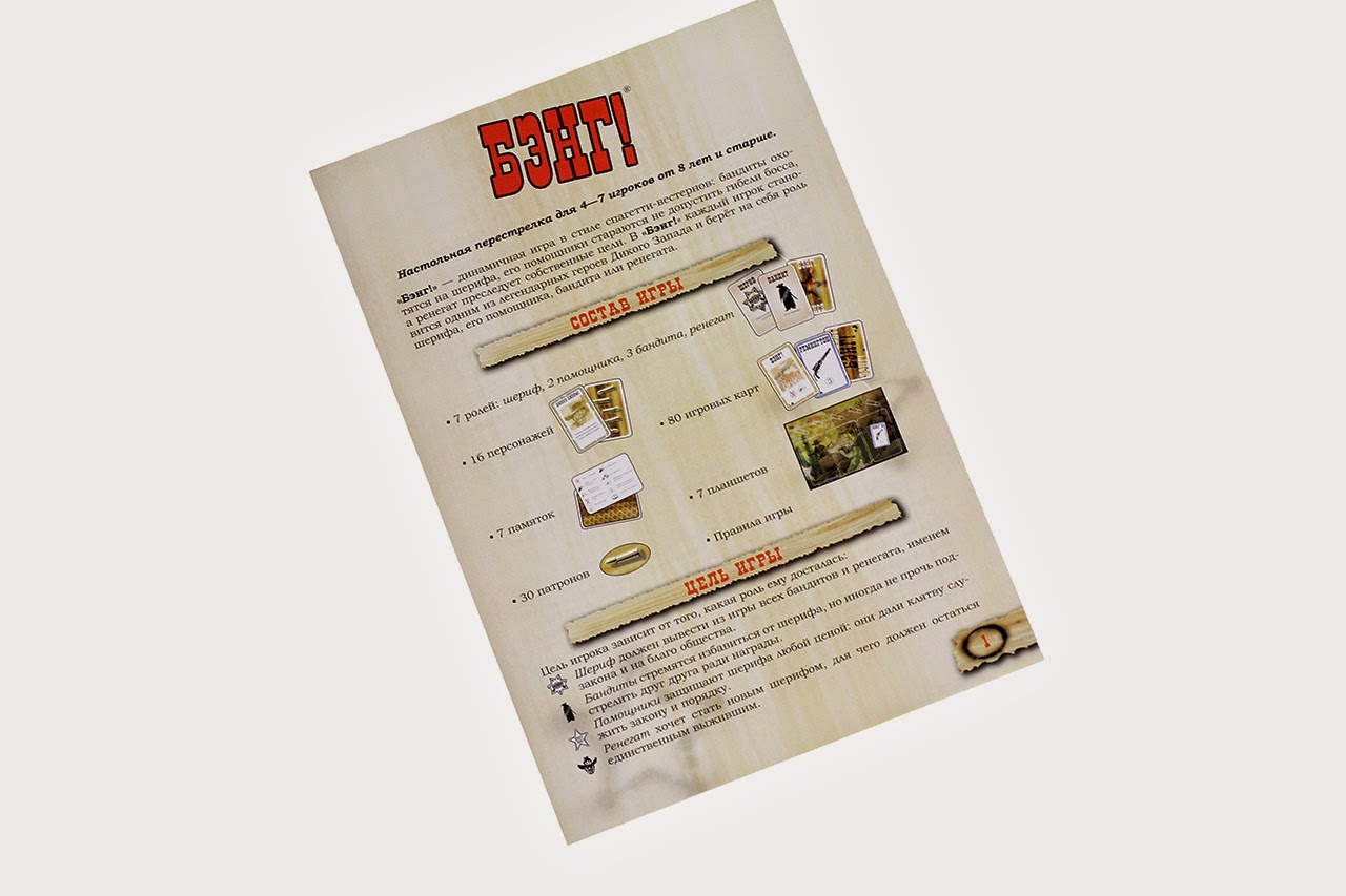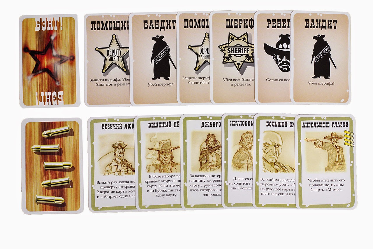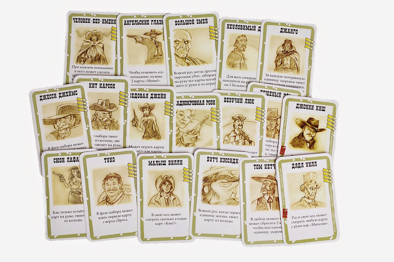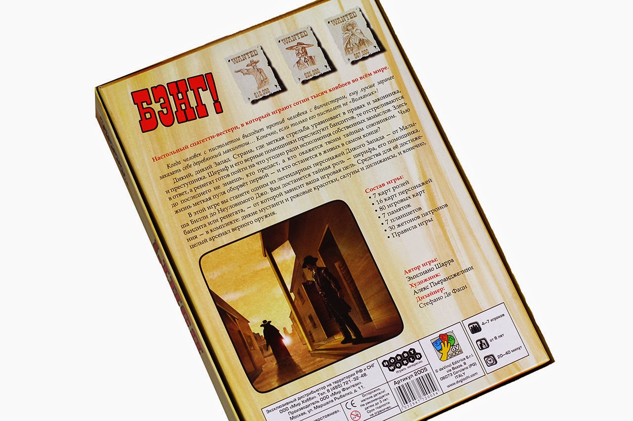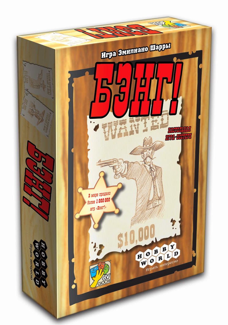 «Бэнг!» — это настольный спагетти-вестерн, в который играют сотни тысяч ковбоев во всём мире. Вы станете одним из легендарных персонажей Дикого Запада — от Малыша Билли до Неуловимого Джо. Вам достанется тайная роль — шерифа, его помощника, бандита или ренегата, — от которой зависит ваша игровая цель. Средства для её достижения — в комплекте: дикие мустанги и роковые красотки, салуны и дилижансы и, конечно, целый арсенал верного оружия. Чью жизнь меткая пуля оборвёт первой — и кто останется в живых в самом конце?