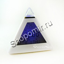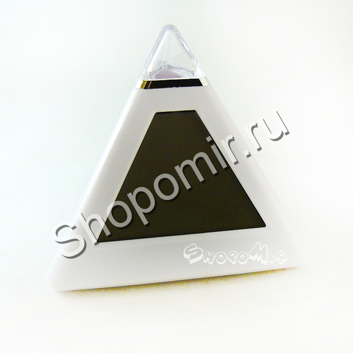 Эти часики выполнены в форме небольшой белой пирамидки, которая подсвечивается приятной подсветкой: 7 различных цветов плавно сменяют друг друга, создавая в целом атмосферу релакса.