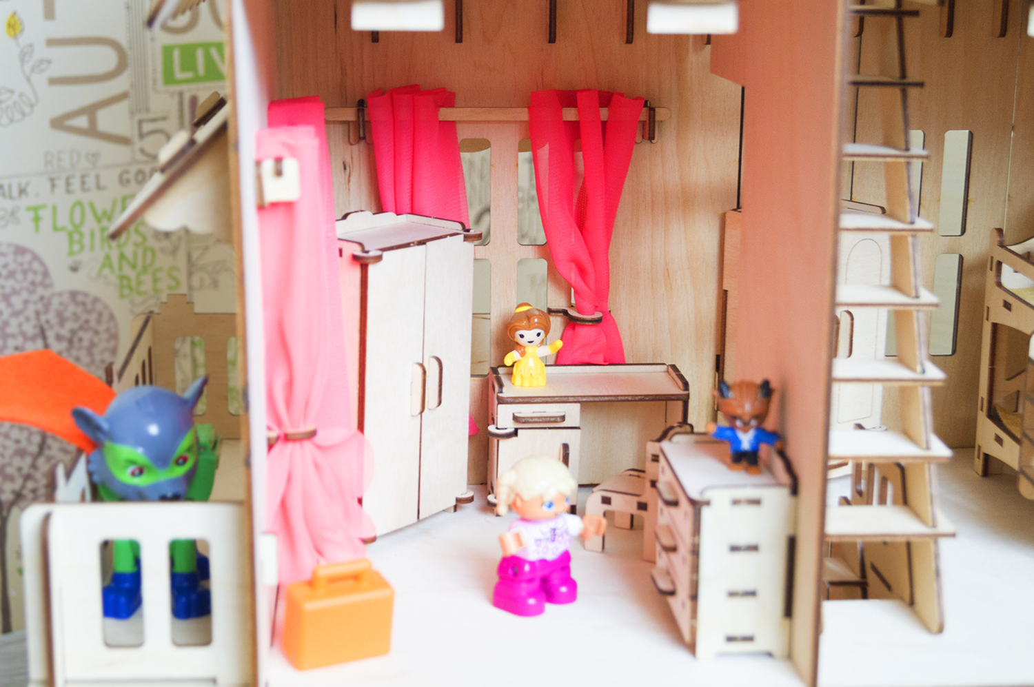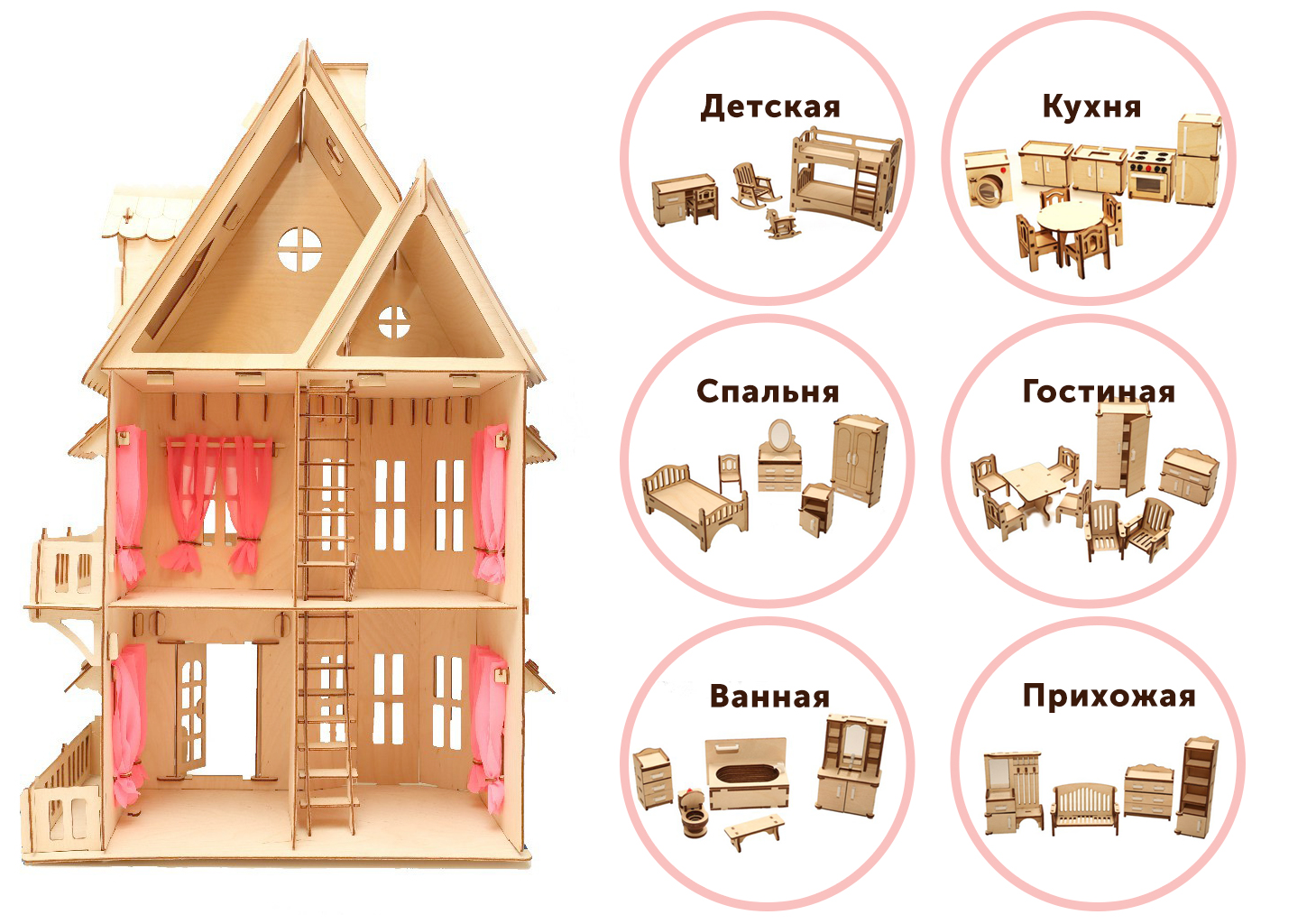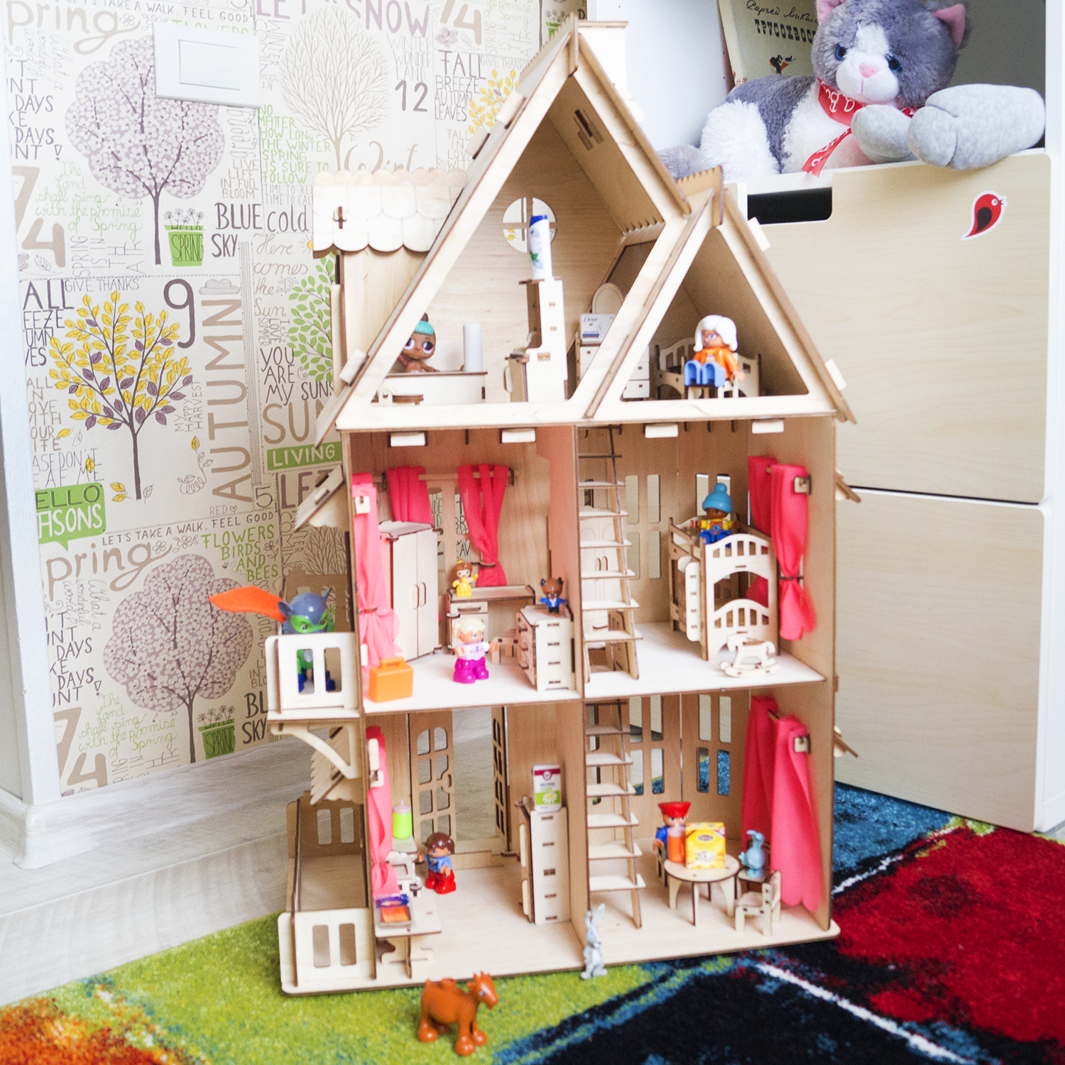 На первом и втором этажах есть лестница и балкон. Резаная крыша, лестница на каждый этаж - разве не чудо! Кукольный дом 3 этажа также в комплекте имеет шторки на окна.
