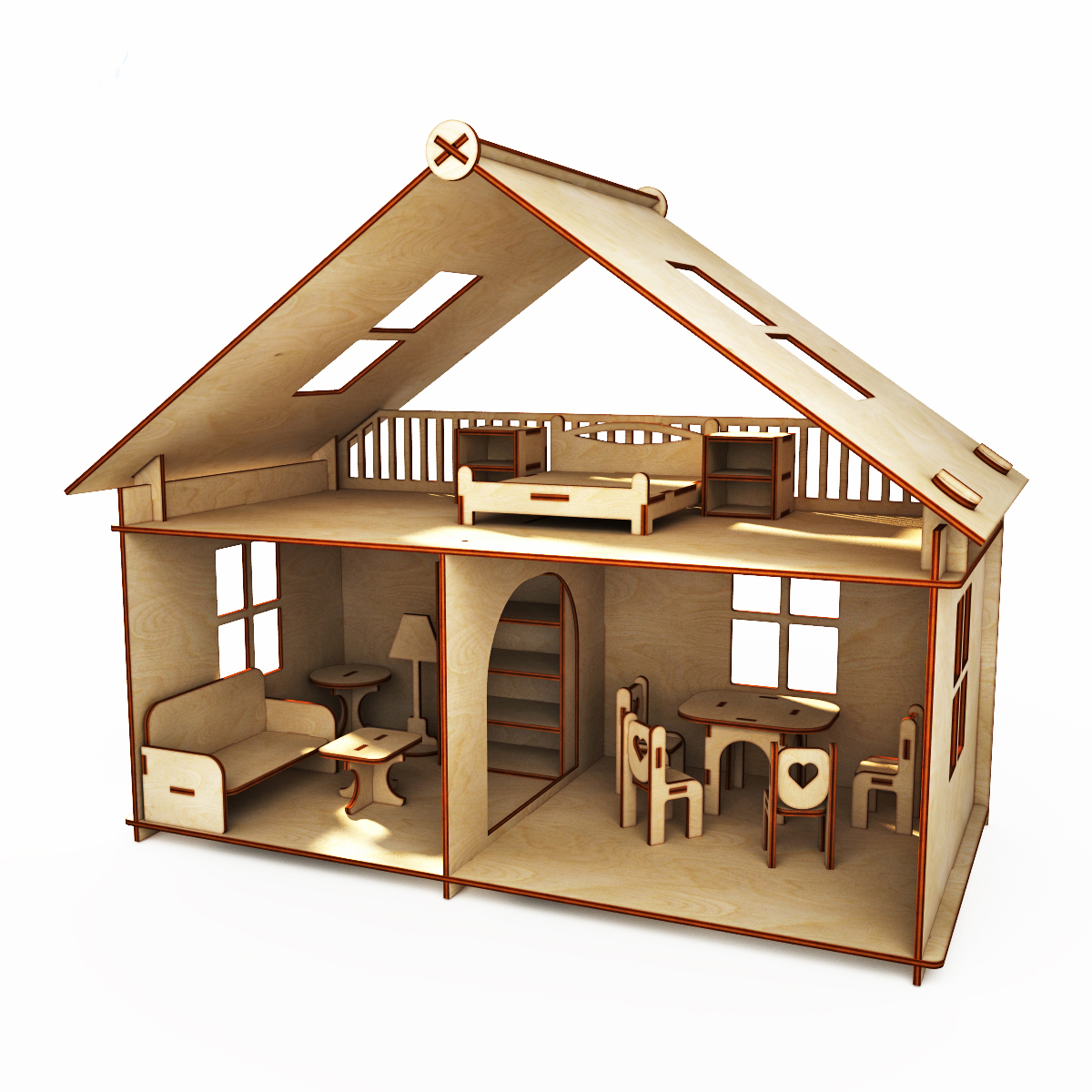 Простой кукольный домик из дерева с мебелью в три комнаты. Особенность этого домика это мебель, которая входит в набор. В спальне двухспальная кровать, а в набор "зал" входит даже диван. Сшейте для него мягкое основание, будет еще реалистичнее.