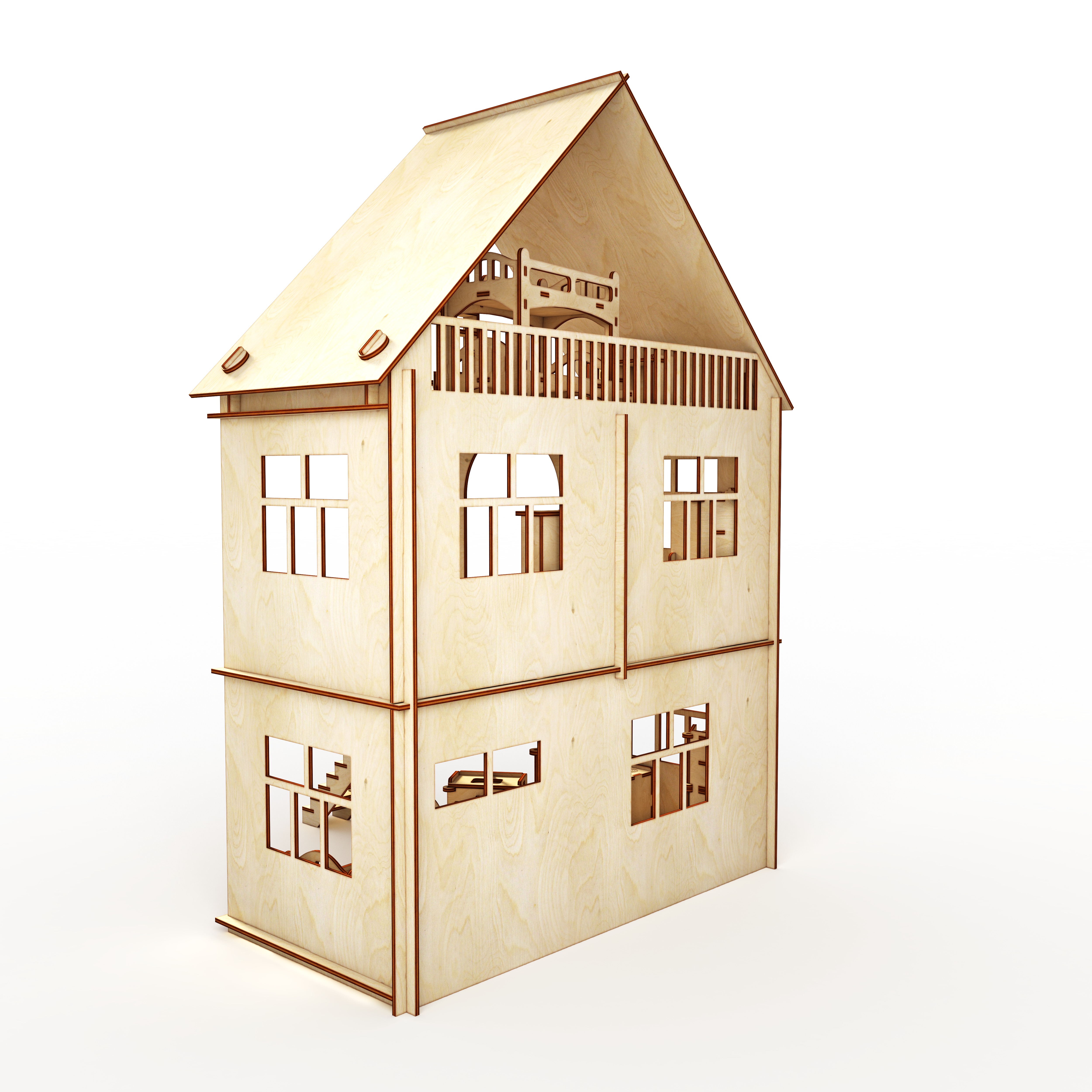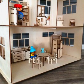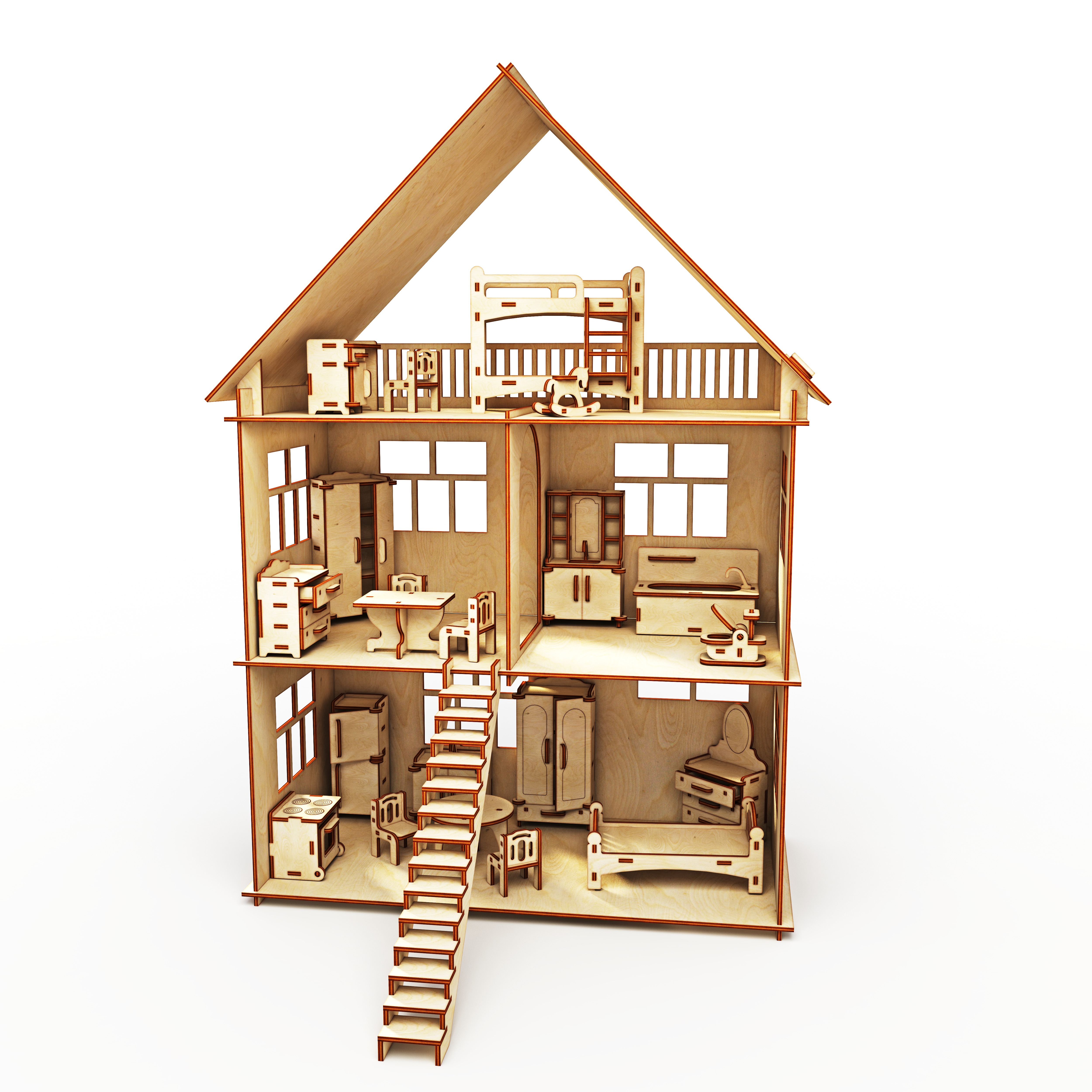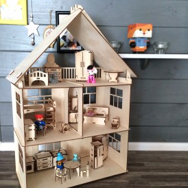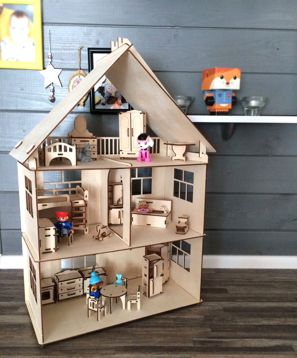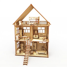 Кукольный домик из фанеры,включает в себя домик и мебель. Фанерный дом состоит из 2-х этажей и мансарды.