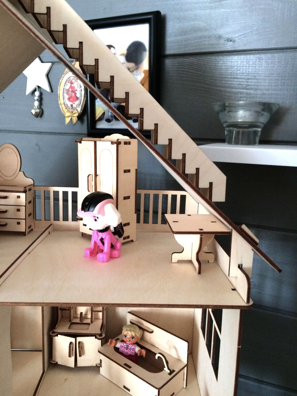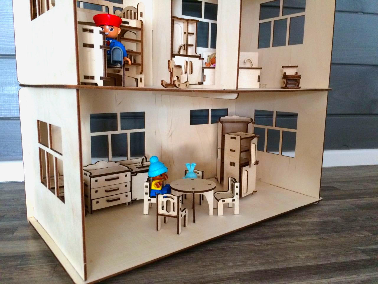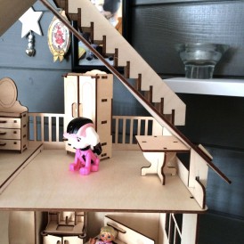 В наличии также есть похожий кукольный домик из фанеры, но с присройкой.