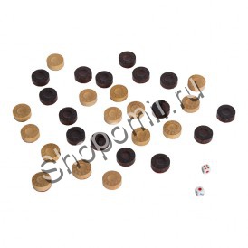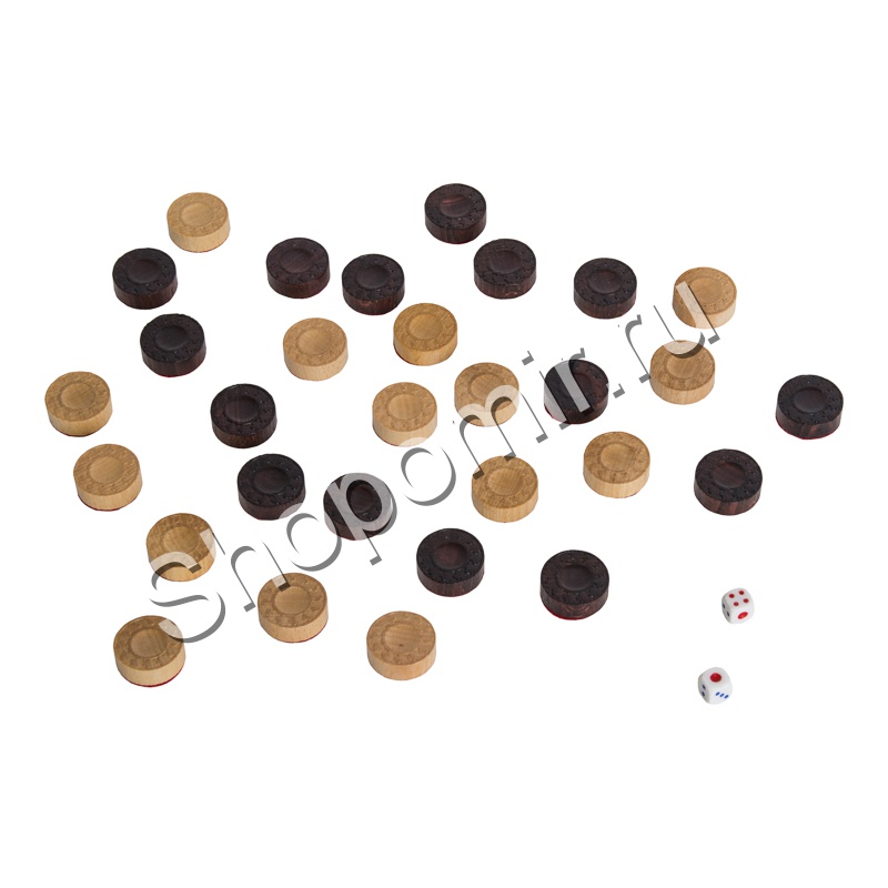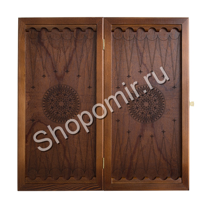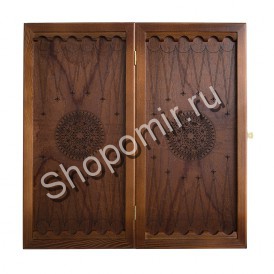 Игровое поле из темного дерева украшают геометрические орнаменты. Половинки поля являются зеркальным отражением друг друга. Комплект фишек также украшен резьбой, повторяющей основной рисунок. Лузы, расположенные по краям доски, служат для правильной расстановки фигур перед партией.