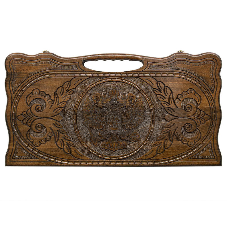 Внешним украшением тут служит вырезанное изображение российского герба. С обеих сторон имеется узор в виде лаврового венка и мелкого текстурирования. На задней поверхности имеется поле для игры в шашки, которое позволит отвлечься от напряженных партий в нарды. Изнутри ячейки подчеркиваются при помощи удлиненных треугольников. На петлях имеется гравировка эмблемы мастера, в форме буквы H. Для переноса в руках предусмотрена ручка с эргономичными прорезями. Мягкий тканевый чехол поможет обезопасить поверхности от налипания грязи и пыли при длительном хранении.