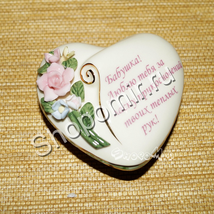 Любимой бабуле угодить с подарком, пожалуй, труднее всего. Современная техника и новенькие гаджеты ее вряд ли заинтересуют. А вот миниатюрная шкатулочка с посвящением «Бабушке» придется в самый раз. Хрупкое изделие изготовлено из белого фарфора.